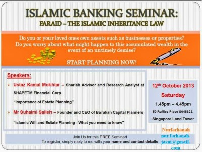 I would like to extend the invitation to the upcoming Islamic Banking Seminar-Faraid, The Islamic Inheritance Law. Alhamdulillah that the previous seminar, Islamic Banking Seminar-Real Estate Investment Trusts (REITS), was a successful event. Therefore, I would like to invite those who are interested in this event to register to me immediately by email at nur.farhanah.jasni@gmail.com , as registration is on a first come first serve basis. The details are as follows: